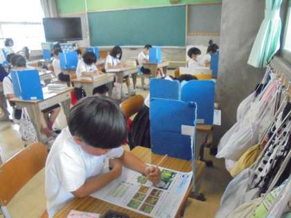 理科は、まとめテストをしていました。1学期の学習を振り返ります。外国語活動では、いろんな色を英語で教わりました。すぐに上手になりました!