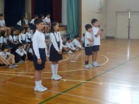 体育参観の練習を開始しました。先生から、曲の説明を受けたり、ポーズの練習をしたりしています。今日は、少し暑く感じました。水分をたくさん持たせてください。