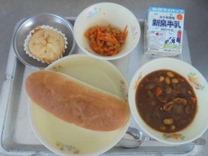にんじんシリシリは、沖縄料理です。本当は、卵も入りますが、給食ではにんじんとマグロの油漬けだけのシンプルな具材で、味付けは塩・こしょう・淡口しょうゆだけ。硬いにんじんにやわらかくなるまで火を通すのは難しいですが、調理員さんが、おいしく作ってくれました。子どもたちも「おいしい!」と喜んで食べていましたよ。