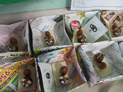 どんぐり工作では,二種類のどんぐりを使って狸の置物を作りました。