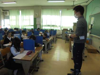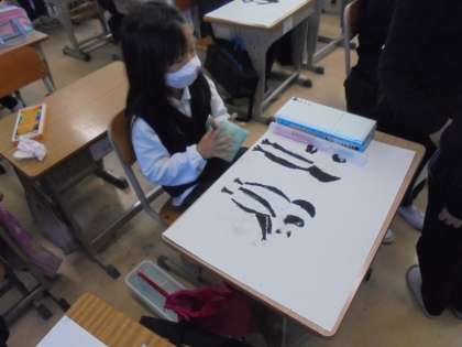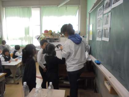 天王寺動物園の動物の絵を描いています。先生にアドバイスをもらったり、友だちの絵を見てアイデアをもらったりしています。国語では、漢字の小テストを行っていました。