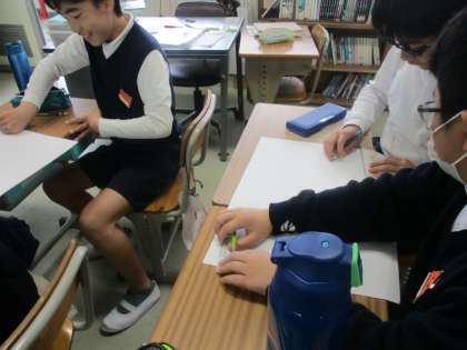 2組の様子です。かばんのゆとりについて考え、みんなに発表することができました。また、ゆとりについて学んだことを生かして画用紙で水筒入れを楽しそうに作る姿が素敵でした。