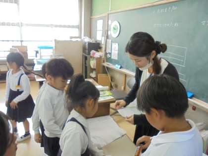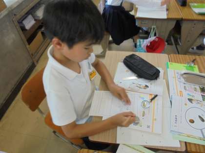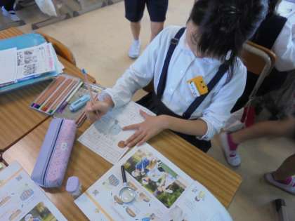 ホウセンカの種を観察しました。詳しく見るために、虫眼鏡で見ていました。「金色の部分もあったよ!」