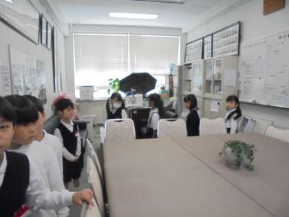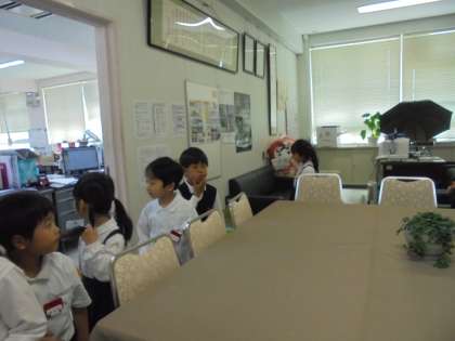 1年生が学校探検をしていました。校長室の見学もしました。「校長先生の机は、大きいね!」