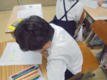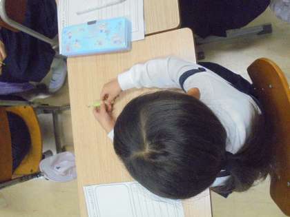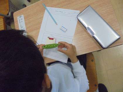今日は、1年生の生活の時間に、えんどう豆の観察をしてもらいました。においや色、手触りなど観察しました。「きゅうりのにおいがする!」「皮はざらざら、豆はかたいよ」などしっかり観察できていました。