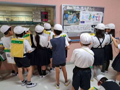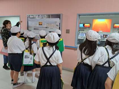 クリーンセンター東工場でゴミの処理について見学しています。ゴミは24時間体制で処理をしてくれることを学びました。