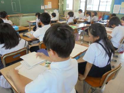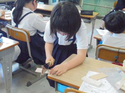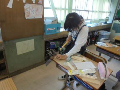 「ギコギコトントンクリエイター」を使って、伝言板を作っています。作成計画は、できているので、予定通りノコギリで切っていきます。総合では「ハイパーキューユー」の質問「自分から友だちを誘っていますか」などに答えていきました。