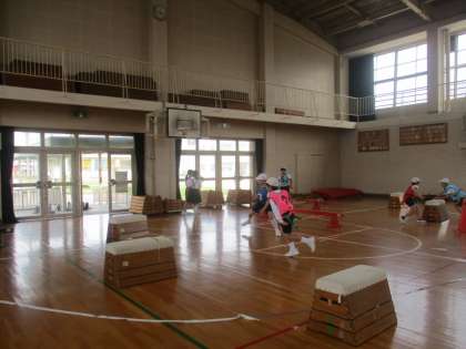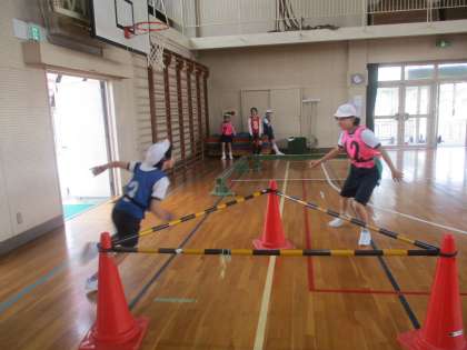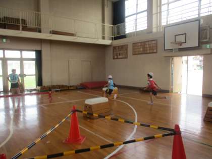 2組の様子です。今日は今まで学んだコツを生かして、障害物を跳び越えたり、くぐったりして鬼ごっこをすることができました。どの子も一生懸命取り組む姿がとても素敵でした。