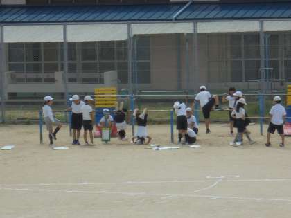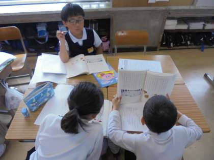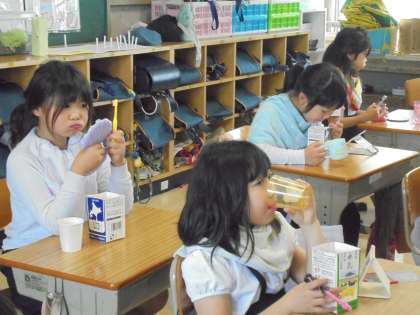 体育では、鉄棒の授業をしました。国語では「こまを楽しむ」の中の部分には、何が書かれてあるのか、班で考えていました。また、歯科衛生士の学生さんたちと一緒に、歯の汚れがしっかりとれているか、確認しました。