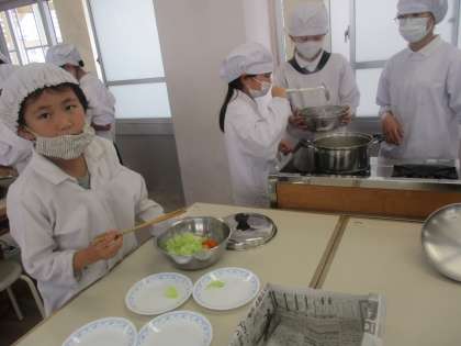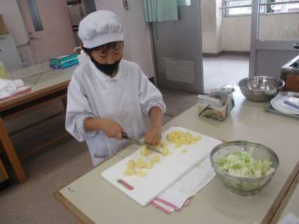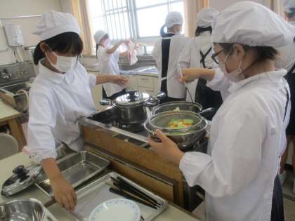 2組の様子です。こちらも初めての調理実習を行いました。週明けの1・2時間目ということでお休みの子が多い中でしたが、休んだ子の分も補いあって取り組む姿が印象的でした。また、安全においしく調理実習ができて素敵でした。
