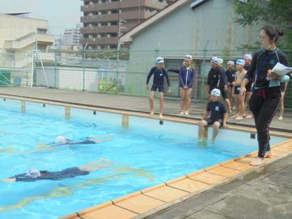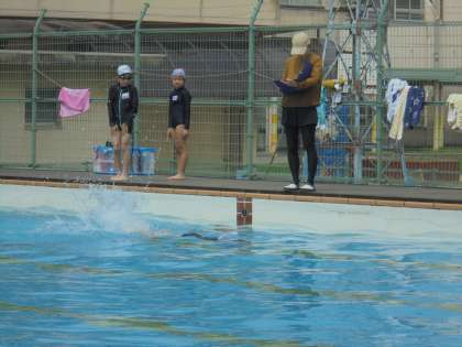 今年度初めてのプール授業です。まず、どれくらい泳げるのか記録を取りました。これから、教え合い活動をして伸ばしていきます。