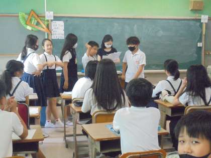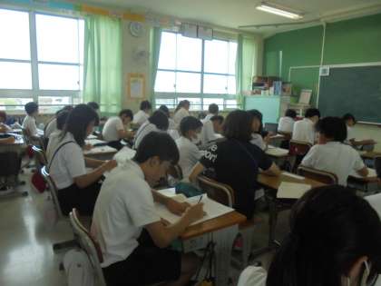 外国語では「My favorite place」を英語で、理由も付けて発表しました。ユニバーサルスタジオの人が何人かいました。総合では「社会をよくするには・・・」を考えて、自分なら・・・何ができるかを文章にしていました。