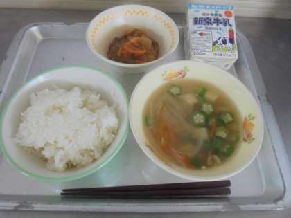 七夕汁には切り口が星の形のオクラを浮かべています。2年生は、夏野菜を植えているので、「オクラや!」と嬉しそうでした。オクラのとろみで、だしもとろっとしていました。