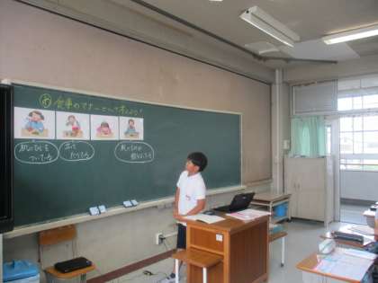 2組の様子です。こちらも食事のマナーについて考えました。日本のマナーだけでなく、世界のマナーを知って驚く姿が素敵でした。友だちと日本のマナーについて楽しく交流することができました。