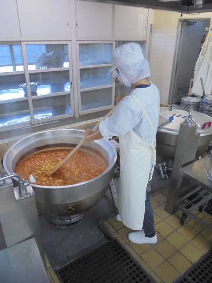 昨日から、異常な暑さになっています。この時期になると、クーラーのない給食室も、暑くなっています。今日も36度まで上がっていましたが、調理員さんはおかずが焦げないように、釜のそばで混ぜ続けてくれていました。
