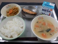 今日の献立は、すいとんじる、れんこんのきんぴら、さけのふうみやき、ごはん、牛乳で...