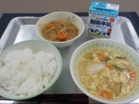 今日の献立は、ワンタン、マーボーどうふ、ごはん、牛乳です。
