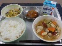 本日の給食は,さつま汁,肉大根,ごはん,ういろう,牛乳です。