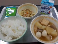 本日の給食は,さつま汁,肉大根,ごはん,ういろう,牛乳です。