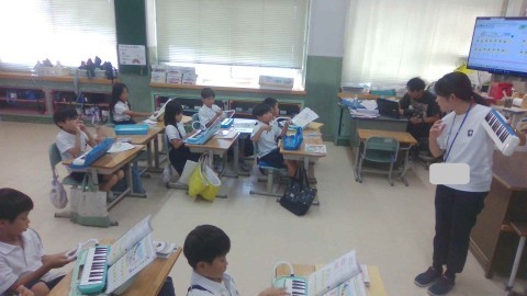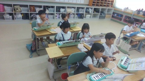 鍵盤ハーモニカの指使いの練習に集中して取り組んでいます。
