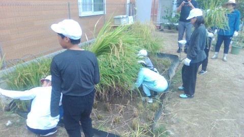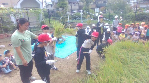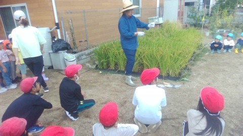 ふくろうの森保育園での稲かり体験がありました。まずは稲かり体験です。カマを使って,夢中で稲かりをしています。