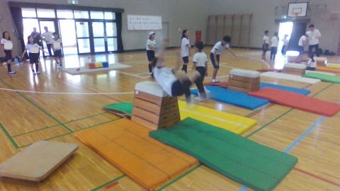 跳び箱の練習に励んでいます。台上前転が上手になってきました。