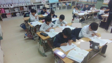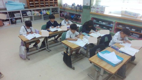 間違っている文章を見つけて,直しています。集中力がすばらしいです!