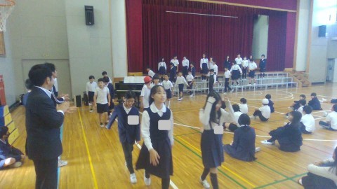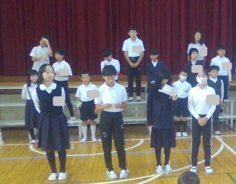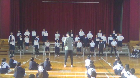 連音壮行会がありました。「やさしい風」の歌を,これまでの練習の成果をいかして,アルトとソプラノのパートのかけ合いを響かせて歌うことができました。4・5年生の子どもたちが学校を代表して,今週の水曜日にフェニーチェ堺にて連合音楽会に参加します。
