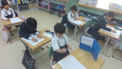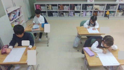 ひき算の復習プリントに集中して取り組んでいます。