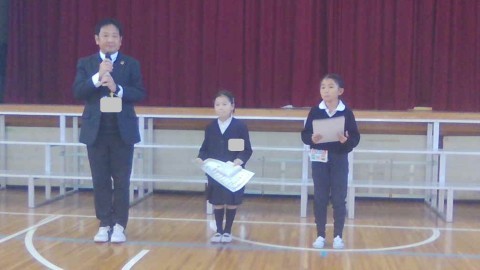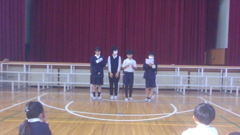 はとぶえや夏休みの作品コンクールの表彰がありました。また,放送委員会からリクエスト曲の募集の案内がありました。