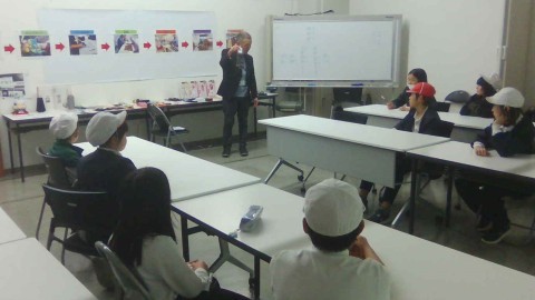 まずは部屋に集まり、福助株式会社の歴史や概要、どんな仕事をしているかについて学びました。
