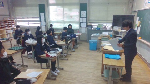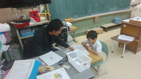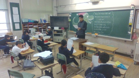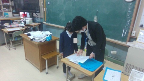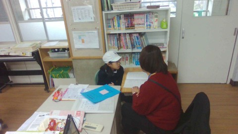 通知表を見ながら担任の先生と一緒に2学期の学校生活を振り返っています。また,クラスで楽しい時間を過ごすことができました。