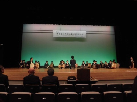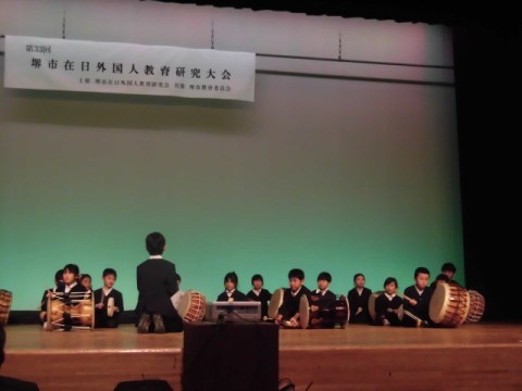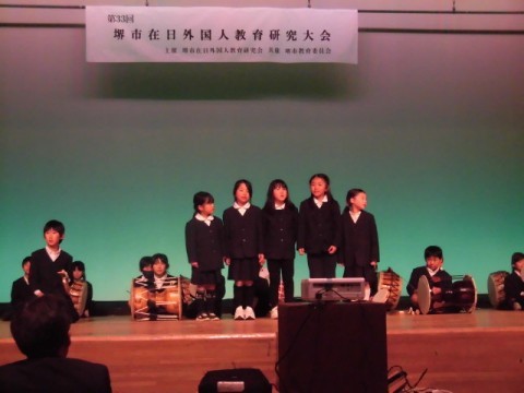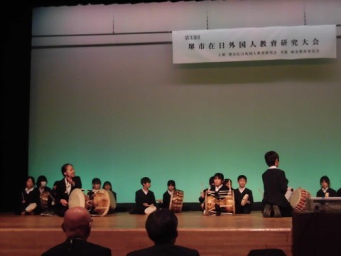 多文化クラスの子どもが堺市の小学校の代表として,韓国の打楽器演奏「サムルノリ」を披露しました。大舞台で少し緊張する姿が見られましたが,堂々と演奏することができました。