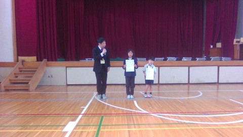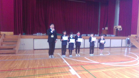 子ども会ドッチボールや読書博士認定証,堺市子ども市展(絵画,書写)の表彰がありました。一人ひとり校長先生より表彰してもらいうれしそうでした。