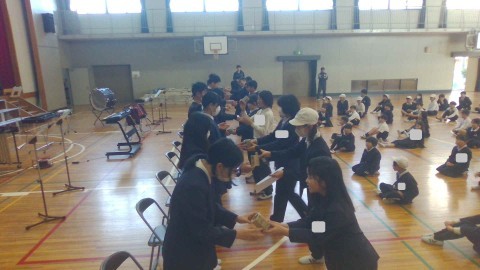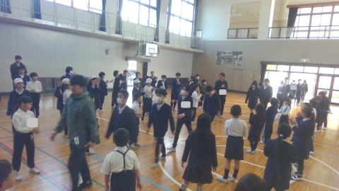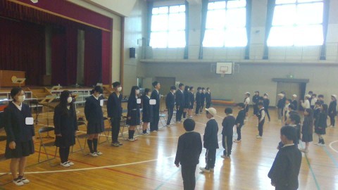 6年生お別れ会がありました。まずは,6年生が入場してきました。次に,校歌をみんなで歌いました。また,在校生からペン立てをプレゼントしました。