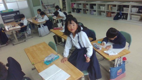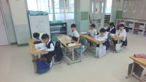 先生の話を聞いて,連絡帳を書いています。子どもたちも大きく成長しました。
