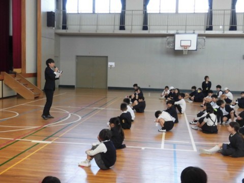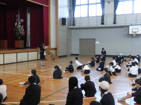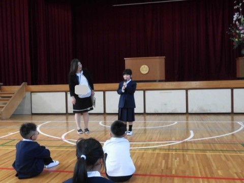 始業式では、まず,新しく少林寺小学校へ転入してきたこどもの紹介がありました。つぎに,校長先生より,担任や担当の先生の紹介がありました。最後に,校長先生や生徒指導主任の先生からは、新たに始まる学校生活について,話がありました。