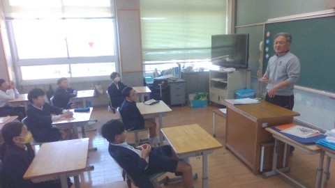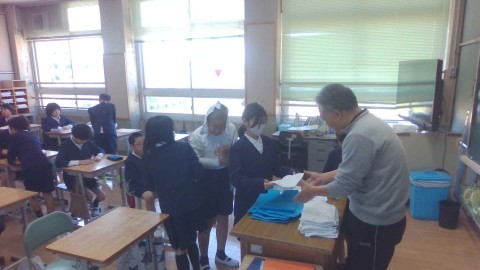 雑巾などを先生へ提出しています。また,新しい担任の先生の話をワクワクしながら聞いています。
