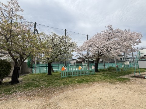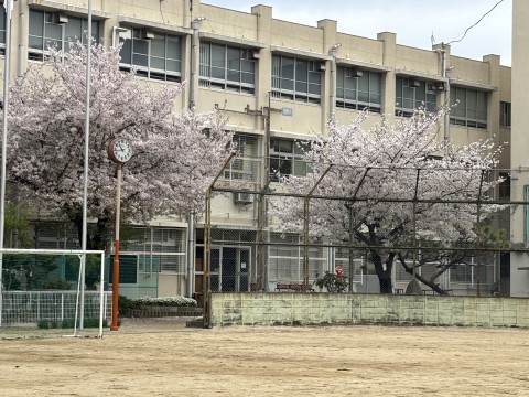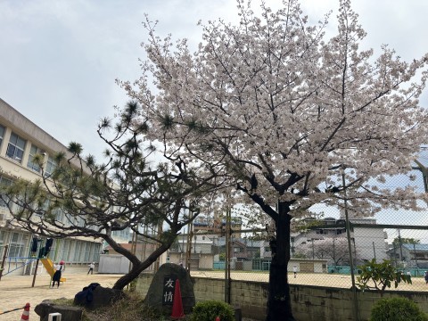 校庭には,ピンクや白の桜の花が咲きほこっています。とても美しいです。