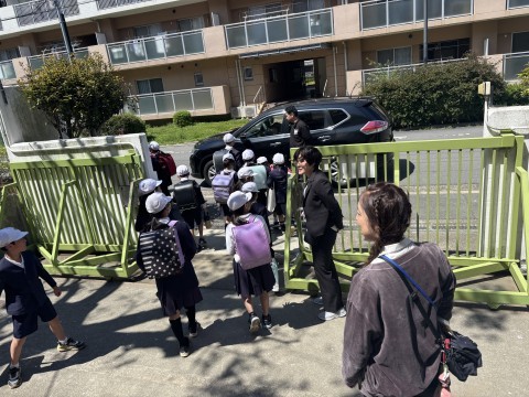 全員が門から出ると,先生たちはお2人に「OK」サインを出し,こどもたちが出たことを知らせます。最後の一人まで帰る姿を見届けてくださっています。