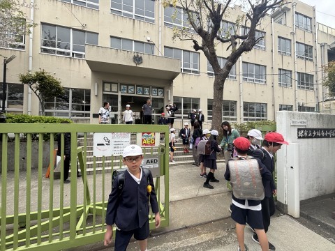 教室で「さよなら」をしたあと,こどもたちは,先生と一緒に正門まできます。