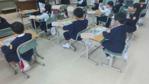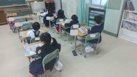担任の先生の話をしっかりと聞いて,教科書の枚数を数えています。