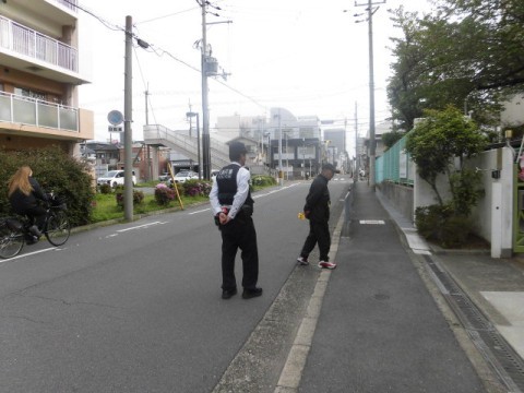「おはようございます」とあいさつをして登校しています。今日は交番のおまわりさんも登校の見守りをしてくださいました。