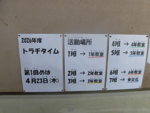 トラヂタイムについて(たてわり活動) 公開日 2026/04/17 更新日 2026/04/17 トラヂ 4月17日(金) 廊下の掲示板にトラヂタイムについての掲示物があります。 多文化クラスの担当の先生が作ってくれています。 トラヂタイムとはたてわり活動の名前です。木曜日の5時間目に行います。世界の国のあいさつも掲示されています。 第1回目は23日(木)です。楽しみですね。 +2
