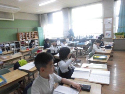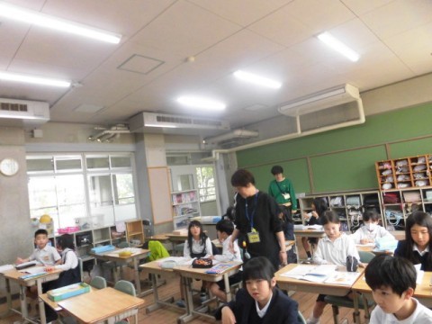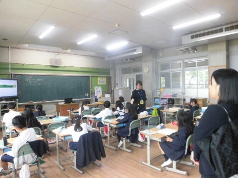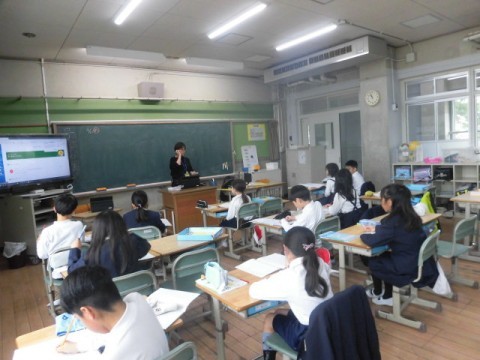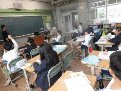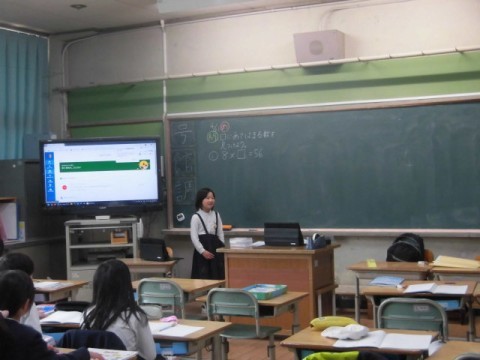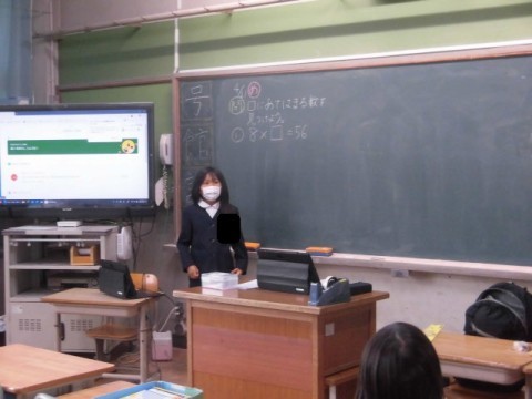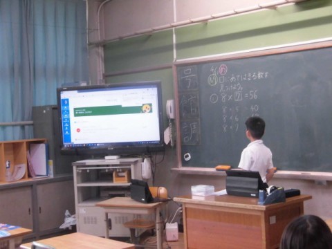 3年生 2 算数 公開日 2026/04/21 更新日 2026/04/21 3・4年生 4月21日(火) 算数「かけ算」の学習です。めあては「□にあてはまる数を見つけよう」です。問題は①8×□=56 □=7と求められます。なぜそうなるのかお友だちと考えを話し合っています。3人の子が前に出て考えを説明していました。②□×6=30 の問題も考えていました。「簡単や〜」「6のだんのかけ算や〜」などとつぶやきもありました。指導主事の先生も見てくださっています。 +7