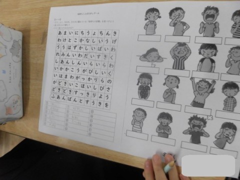 気持ちのよい言葉探しゲームを進んで行いました。また,イラストがどのような感情を表しているかを考えました。
