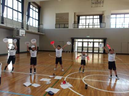現代風ダンスの指導に、「日本ストリートダンス協会」さんから講師で来ていただいています。5月11日の練習では、基本となるダンスをしっかり覚えてから、グループでオリジナルのダンスをつくるために話し合いました。各グループでは、基本のダンスの中に、どのスズメ踊りの振り付けを入れるか、どのタイミングで入れるかを考え、何度もダンスに取り組む姿が見られました。