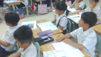三角形や四角形を組み合わせて,魚やお家など,楽しそうに作っています。