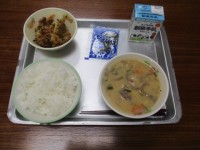 今日の給食は「タッカンマリ風スープ、春菊チヂミ」でした。今日は韓国料理です。タッカンマリは「鳥一羽」という意味で、鶏と野菜などの具を入れて煮込んだ料理です。