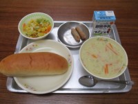 今日の給食のメニューは ミニパン、あげパン、ワンタン、はるさめのいために、ぎゅうにゅう です。